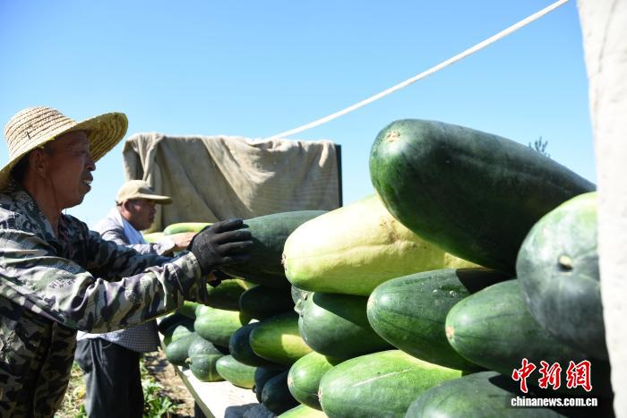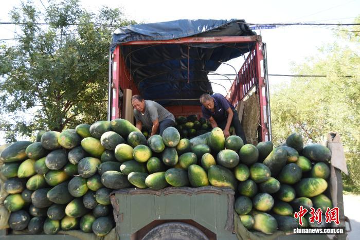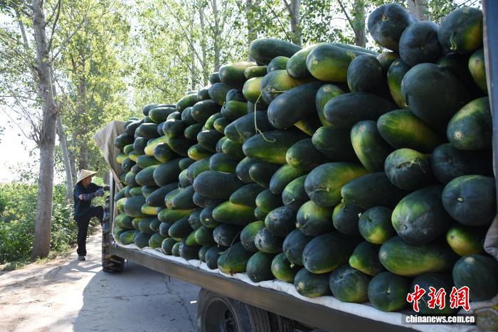 图为农家将采戴的乌皮冬瓜拆车运去边疆发卖。 王宇 摄