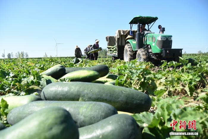 图为庄家将采戴的乌皮冬瓜拆车运出田间。 王宇 摄